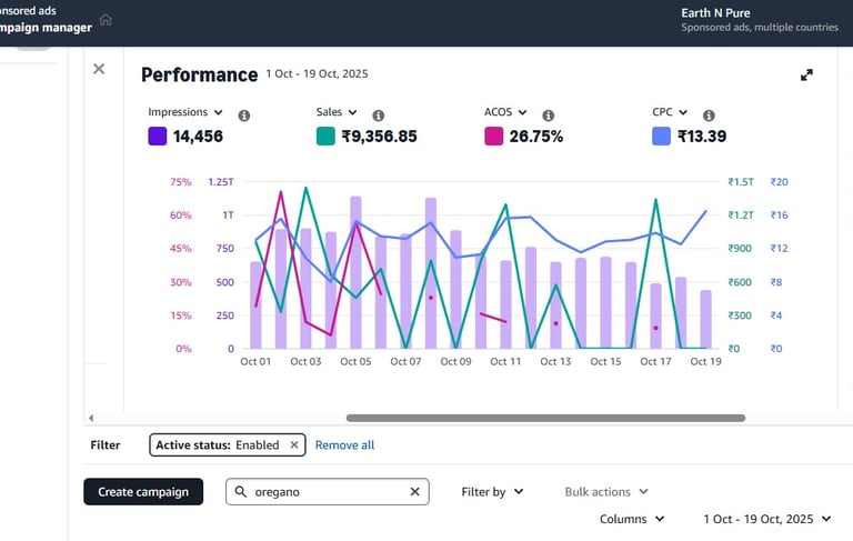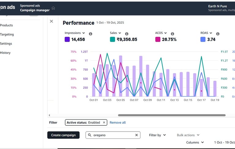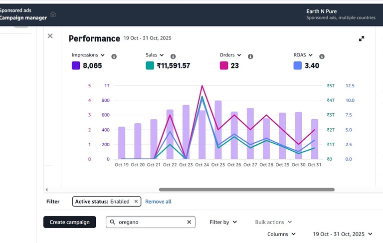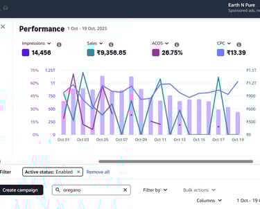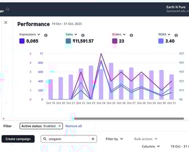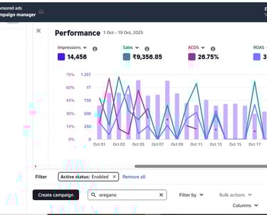 This graph reflects our data-driven approach to eCommerce growth — showing real campaign performance with rising impressions, optimized ACOS, and strong sales. Our expert team manages and analyzes every metric to build, scale, and optimize brand success on Amazon. Through transparency and precise ad strategy, we continuously deliver measurable results and maximize returns.